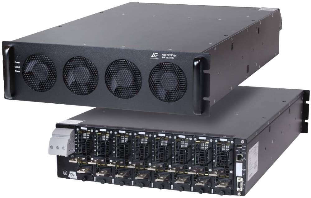 The iHP12/15 Air Cooled configurable power supply is 100% digitally controlled in a 456.2 mm x 447.0 mm x 132.5 mm package and provides eight individual slots that accept intelligent DC-DC converter modules. Each slot may be populated with a separate 3000 W plug-in module with an output voltage range from 0.6 VDC to 300.0 VDC (with eight nominal voltages) for a total output power of 12 kW. For more power with fewer outputs (up to two), the 12 kW modules from 2.5 to 360.0 VDC (with 50 or 300V nominal), which occupy three slots, provides 12kW, leaving one slot available for 3000 W modules for up to 15 kW in the standard iHP12 case at 480 VAC 3-phase, nominal input.