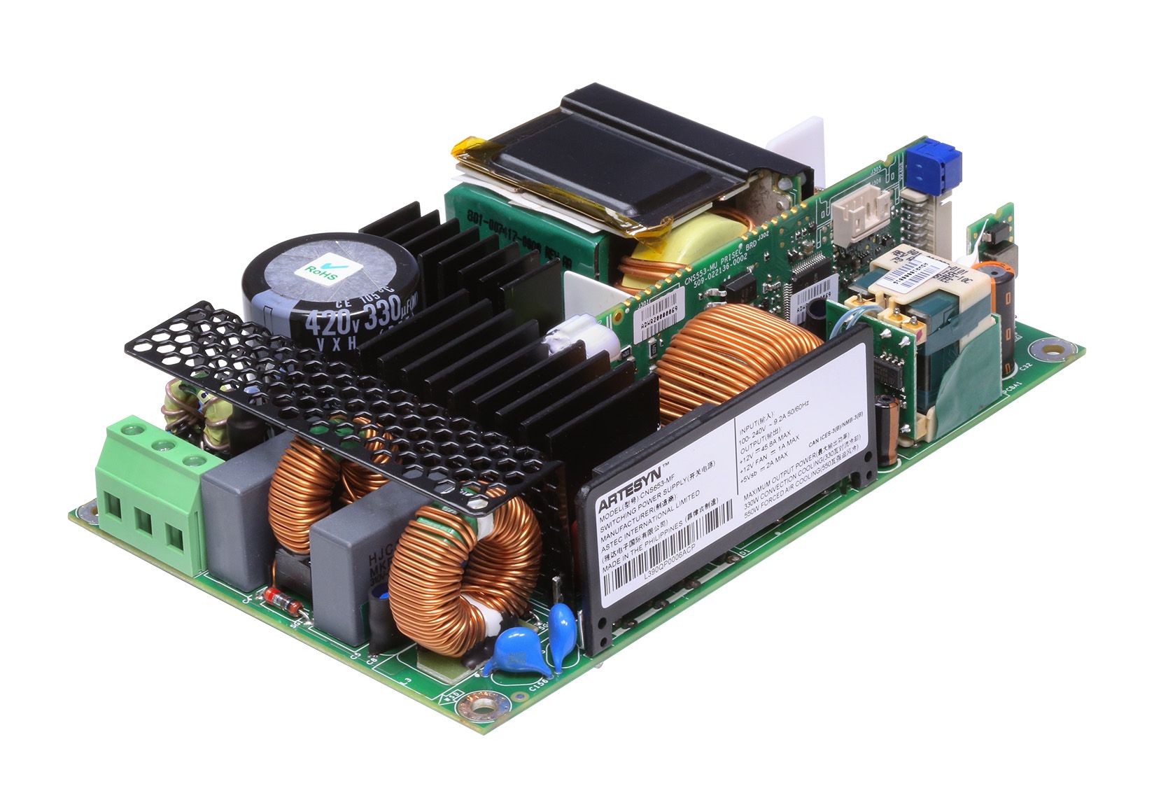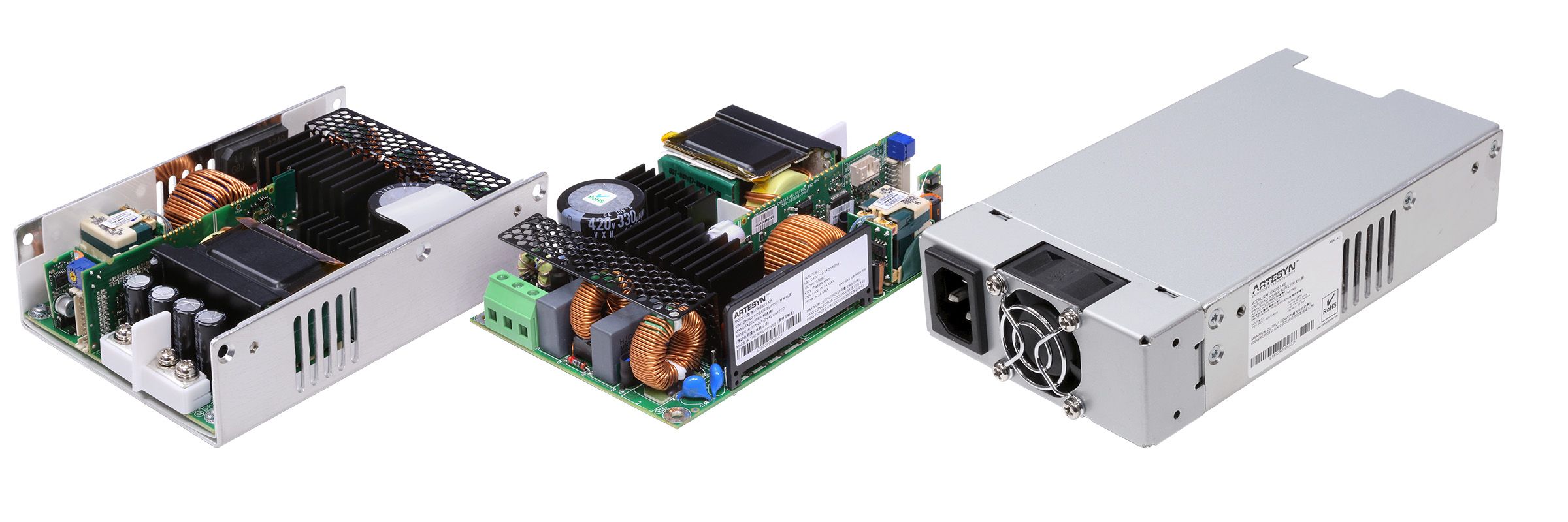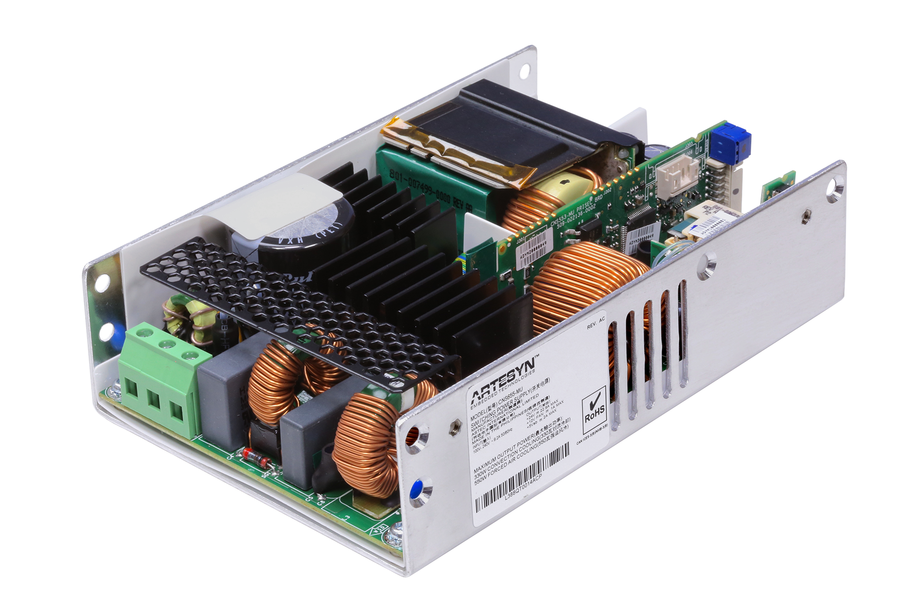 The CNS650-MU series of single output open-frame AC-DC power supplies are offered in 12 V, 24 V, or 48 V outputs with +15% Trim range. Each power supply comes with a 12 V fan output and 5 V standby. All models feature ITE and medical safety approvals and accept a universal input of 90 to 264 VAC. Depending on operating conditions, its 4 inches x 6 inches x 1.54 inch compact and high density "U-Channel" Construction delivers up to 400 W of output power with free air convection cooling and up to 650 W with 400 LFM of forced air. These power supplies are ideal for industrial systems as well as for medical applications.